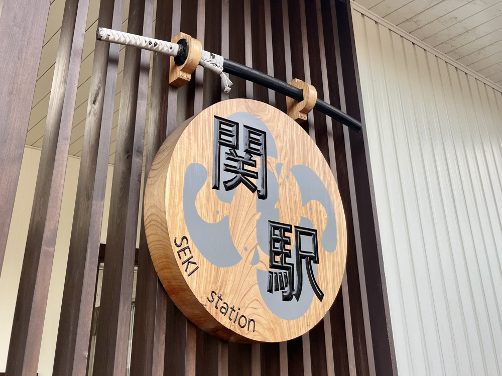 関駅の看板には日本刀が飾られており、フォトスポットとしてもとてもおすすめです。