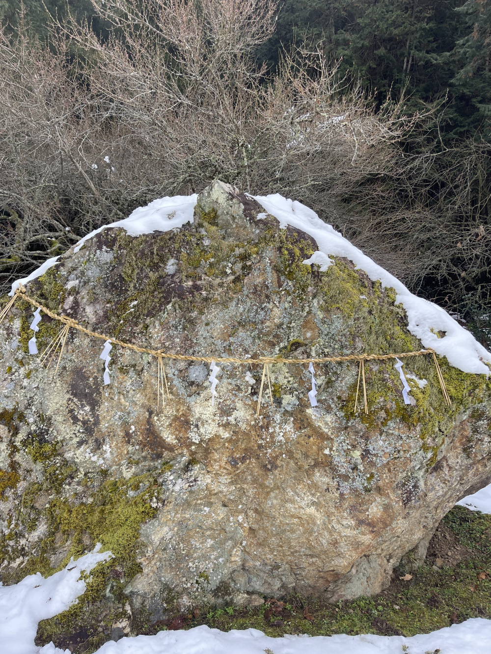 子どもたちに食べ物をもらった鬼が、お礼に空を舞い、その途中で落としてしまったのがこの岩なのだとか。 雪や苔に覆われた姿は、どこか物語の世界そのもの。思わず立ち止まって見上げたくなる、不思議なスポットです。