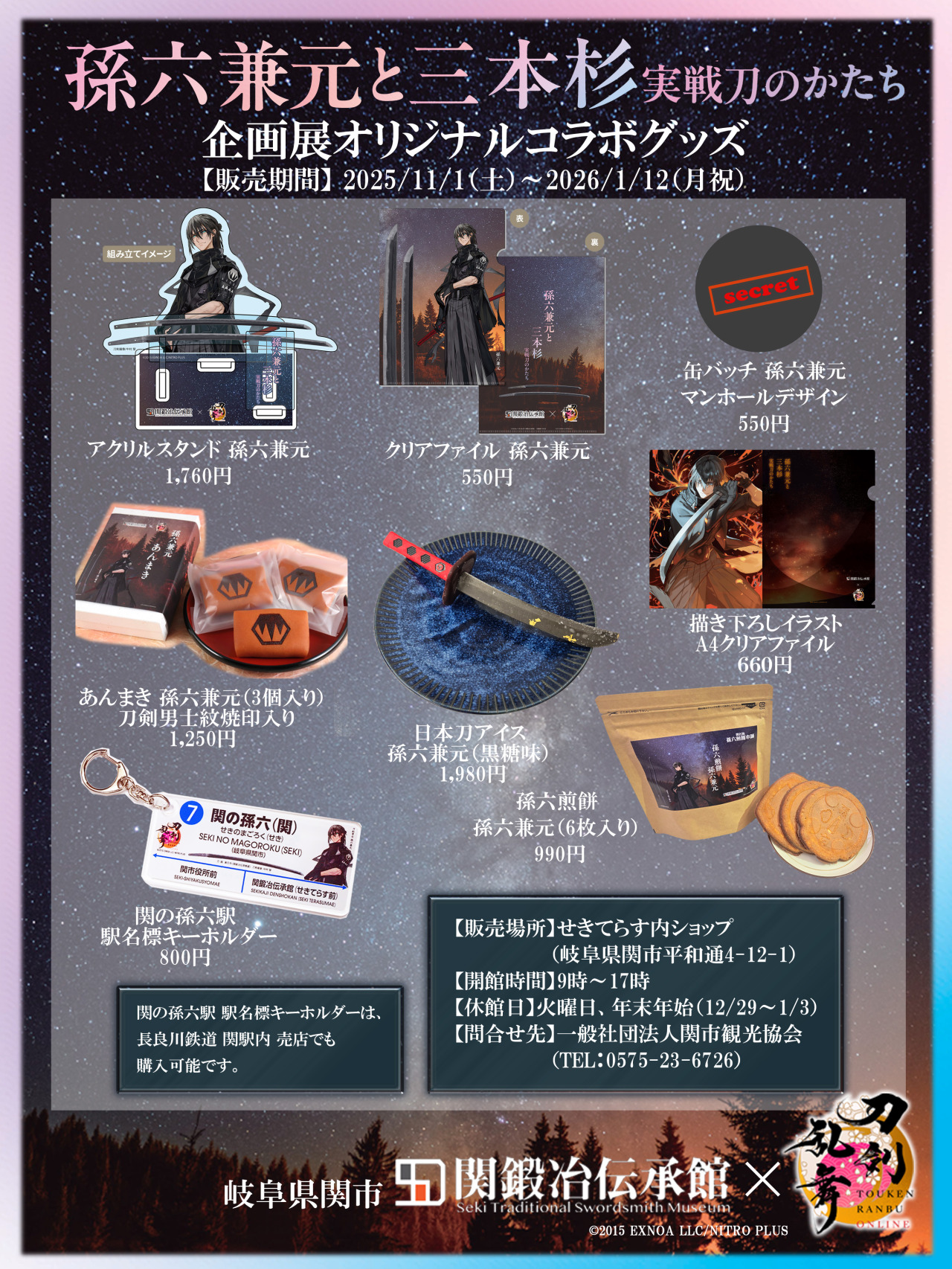 関鍛冶伝承館 特別企画展「孫六兼元と三本杉 ~実戦刀のかたち~」 の開催期間中、「せきてらす」内ショップに刀剣乱舞万屋本舗ミニ出張所がやってきます!