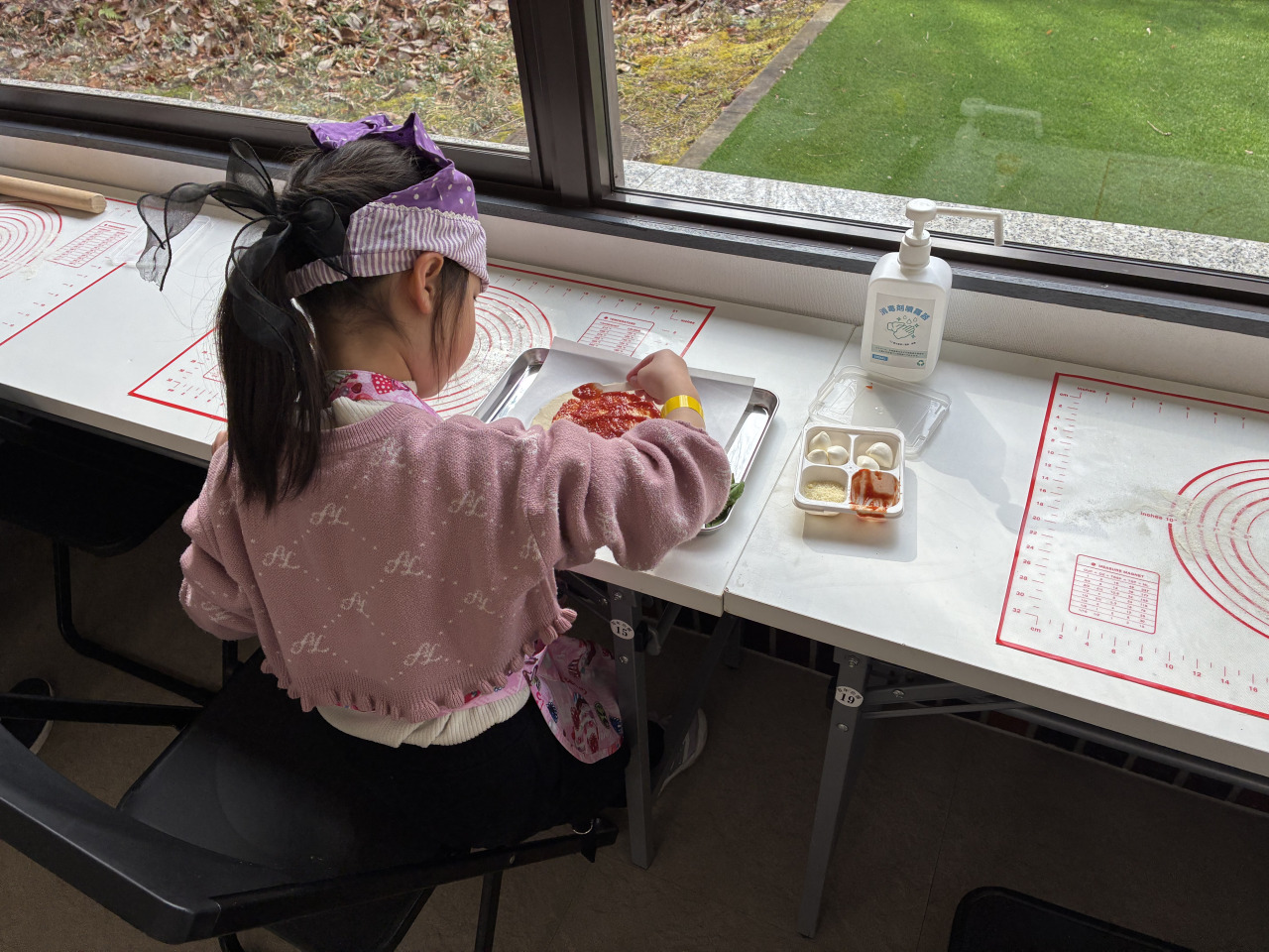 ピザづくりでは、生地をのばしてトッピングし、本格的な薪窯で焼き上げます。