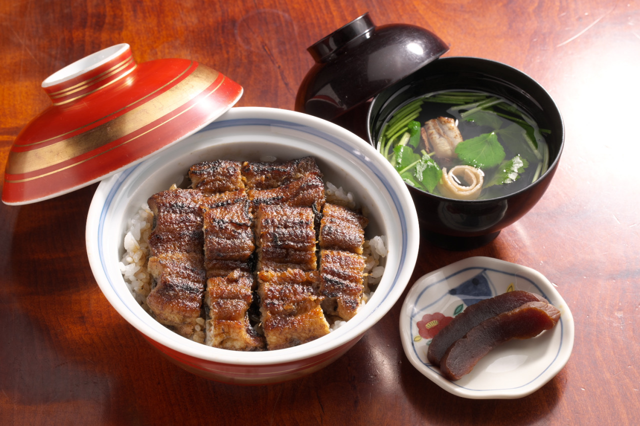 名物「うなぎ丼」は、備長炭で香ばしく焼き上げたうなぎに、甘すぎない秘伝のタレを絡めた逸品。