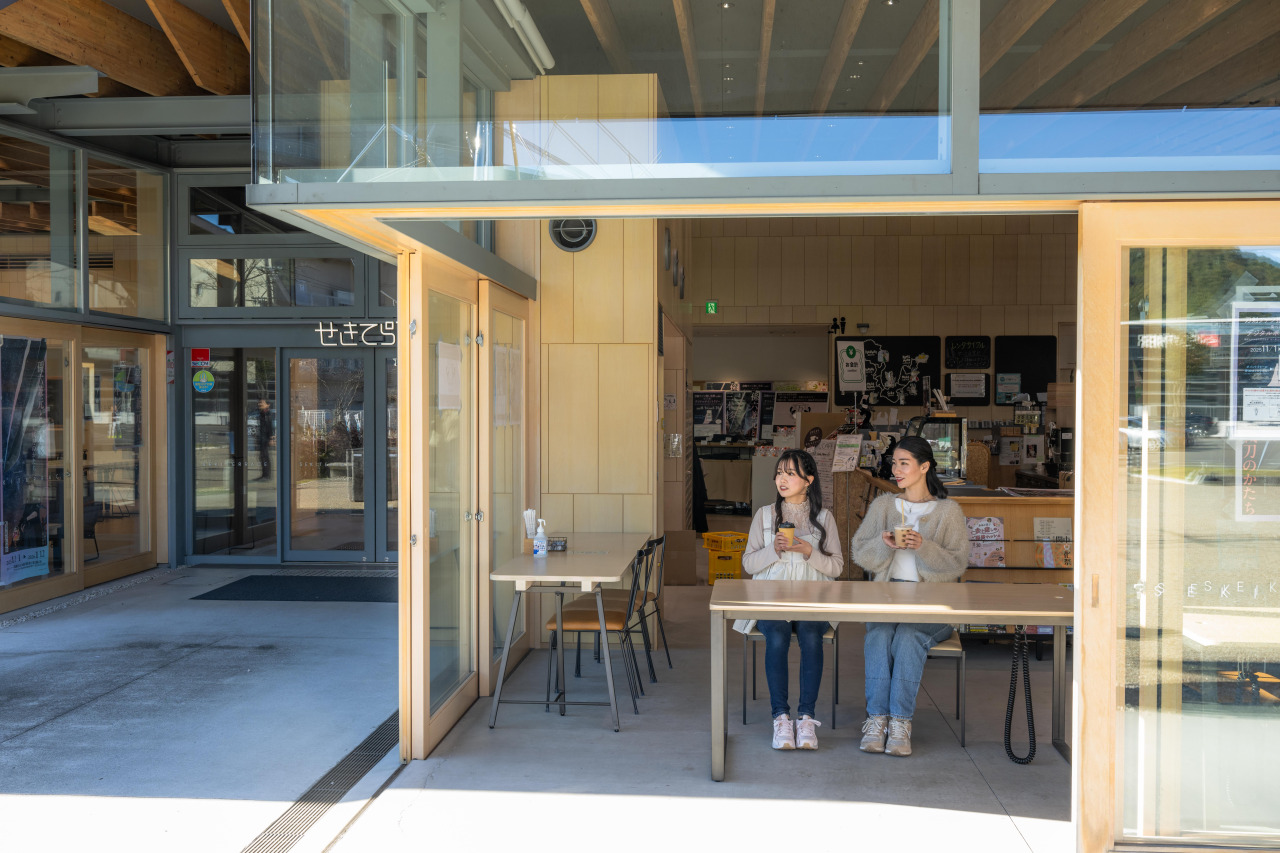 せきてらすの敷地に隣接する関川沿いでは、カフェで購入したドリンクを片手に、川沿いの遊歩道を散策したり、自由に使える芝生でお花見を楽しんだりできます。