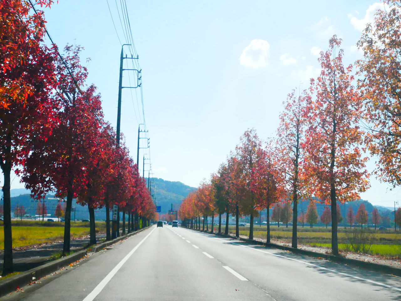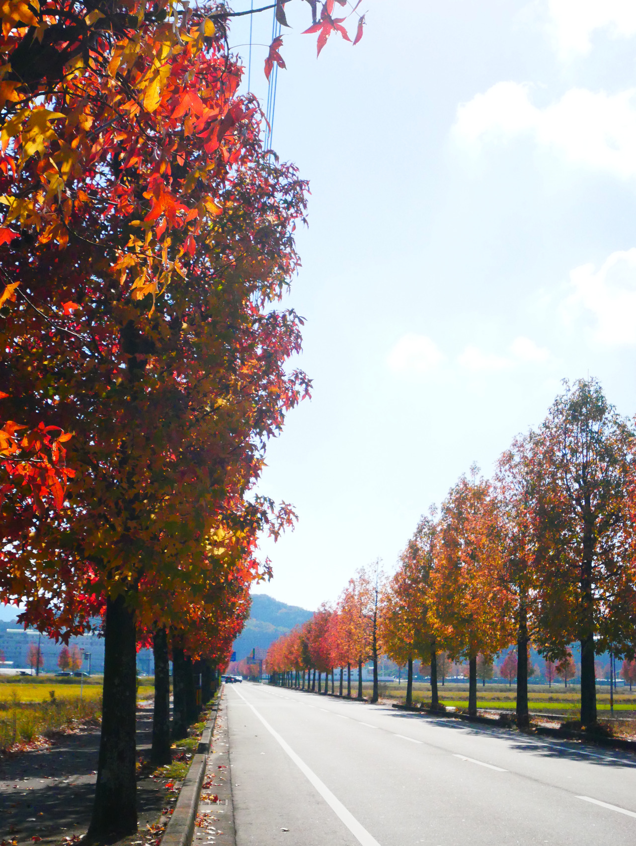 道路沿いに続く並木は、ドライブや散策にもぴったりの紅葉スポットです。